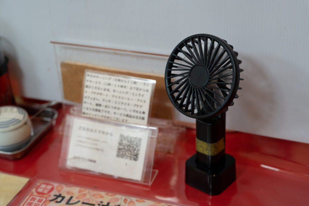 汗をかいても大丈夫!各テーブルに一台ずつ、小型扇風機が配置されています
