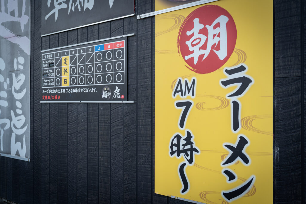 「麺や虎」は現在、土日祝日は朝7時から夜21時まで(休憩時間 有)という長時間の営業を行っています。この営業時間は、地域の需要が反映されています。