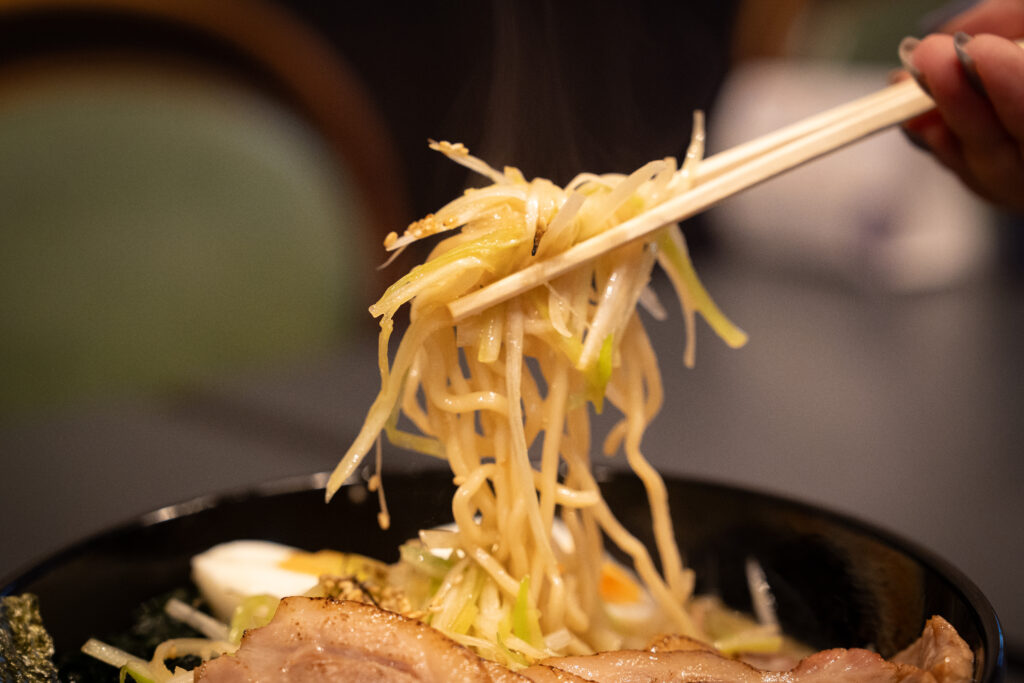 実際に食べてみると、香ばしく炙られたチャーシューの香りが口の中でひろがり、特製白髪ネギとの相性も抜群です。見た目のインパクトから想像する以上に、女性でも朝から楽しめる味わいになっています。