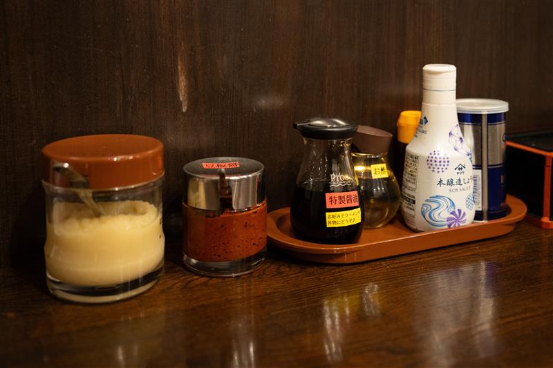 「麺や虎」の魅力の一つが、豊富な卓上調味料です。特製醤油、豆板醤、酢など、自分の好みに合わせてカスタマイズできる楽しさがあります。