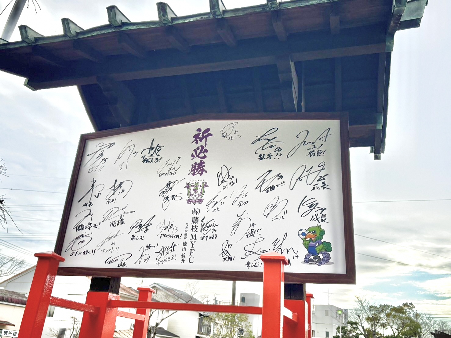 選手がサインと願いを記入した巨大絵馬が飾られています。