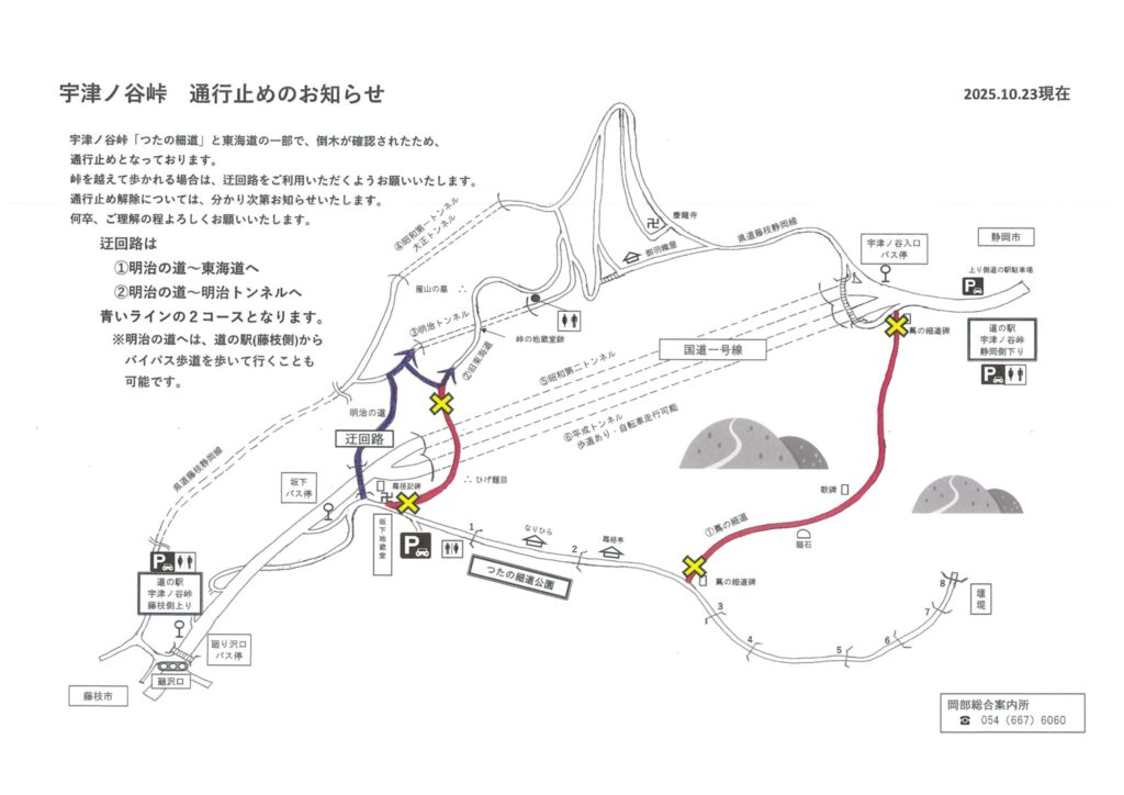 宇津ノ谷峠「蔦の細道」と東海道の一部で、倒木が確認されたため、現在通行止めとなっております。峠を越えて歩かれる場合は、迂回路ご利用ください。なお通行止め解除につきましては、わかり次第お知らせいたします。